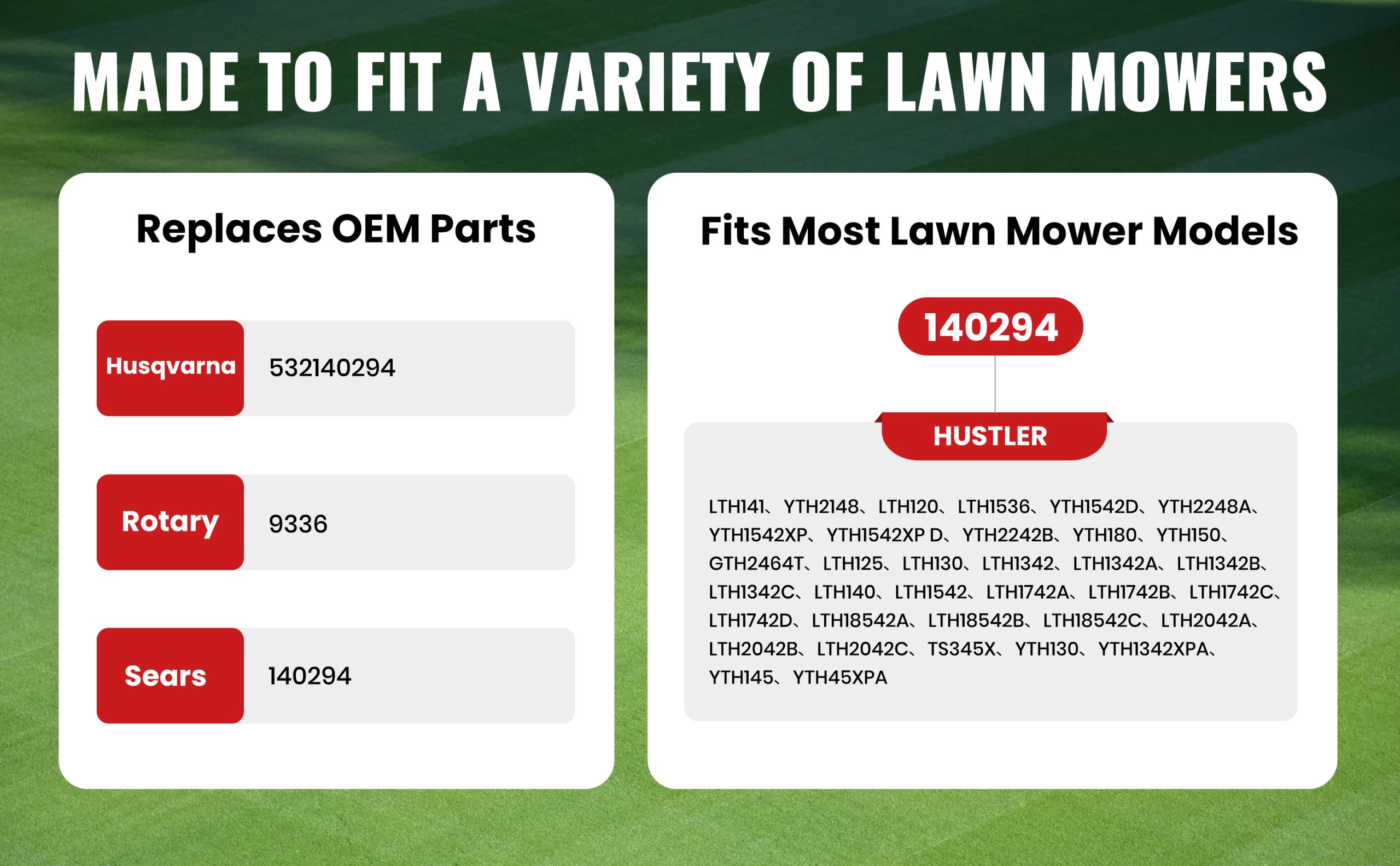 - 【PERFECT FIT OEM REPLACEMENT BELT】140294 ground drive belt with exact 1/2″ x 82-1/4″ dimensions. Direct replacement for Husqvarna 531300768 532140294; AYP 140294 532140294; Craftsman 24103; Josnered 532 14 02-94; McCulloch 532 140294. Compatible with Craftsman LT1000, LT2000, DYT4000, LTX1000; Husqvarna LTH130, YTH180, YTH1842, LTH1742, LTH18542; AYP WE185H42F, Y18H44D Hydro and other 42 inch deck riding lawn tractors.