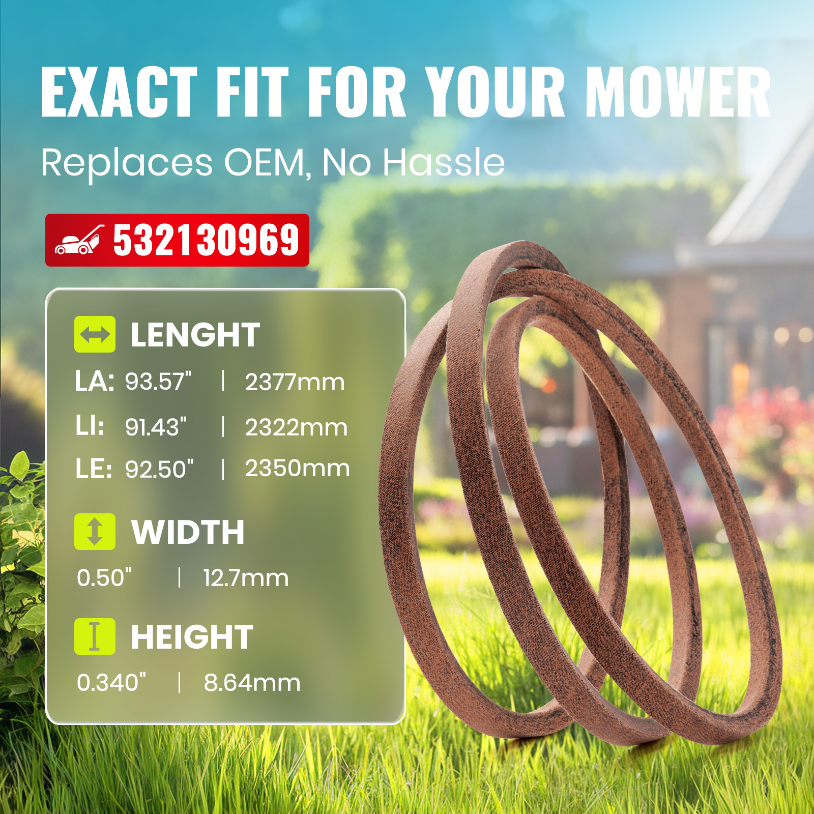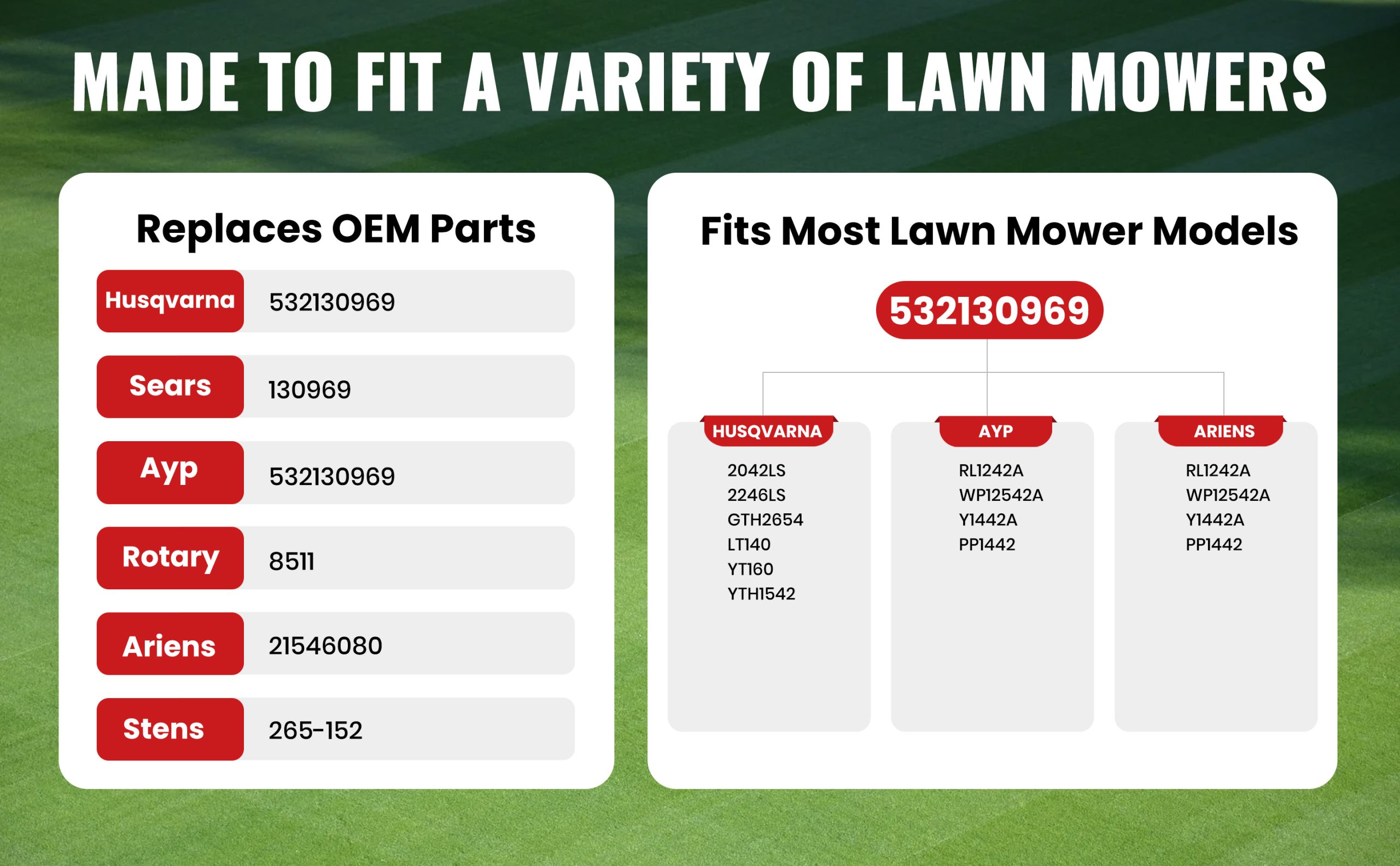 • 【PERFECT FIT OEM REPLACEMENT BELT】532130969 drive belt with exact 1/2″ x 92.5″ dimensions. Direct replacement for AYP 130969, 532130969; Husqvarna 532130969, 592855201; Ariens 21546080, 532130969; Poulan 532130969; Stens 265-152. Compatible with Husqvarna YTH22V46, YTH24K48, YTH2348, YTH18542, YTH21K46, YTH26V54, YTH22V42, YTH24V48, LGT2654, LGT2554, 2042LS, 2246LS, 2346XLS; Poulan Pro PB22H46YT, PB23H48YT.