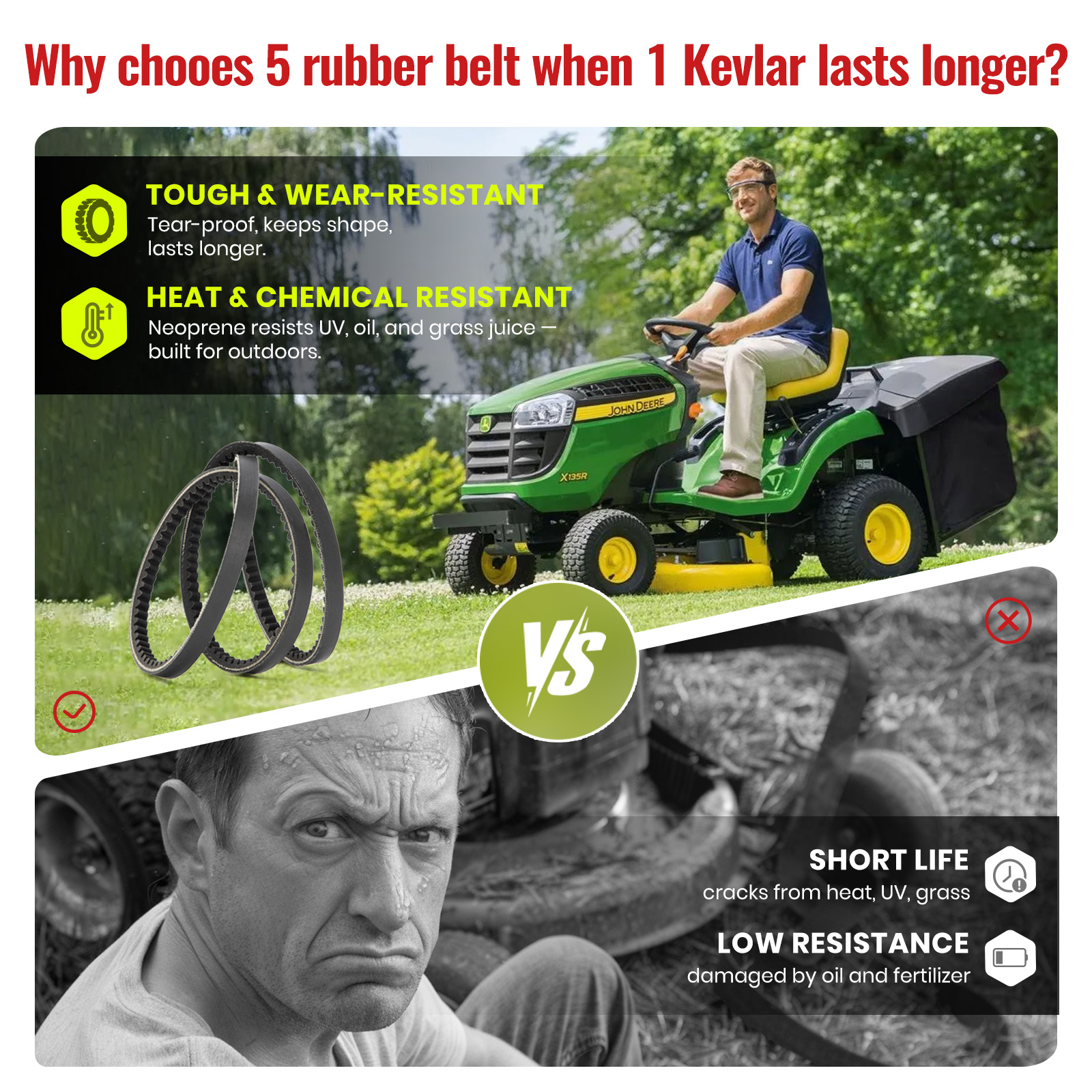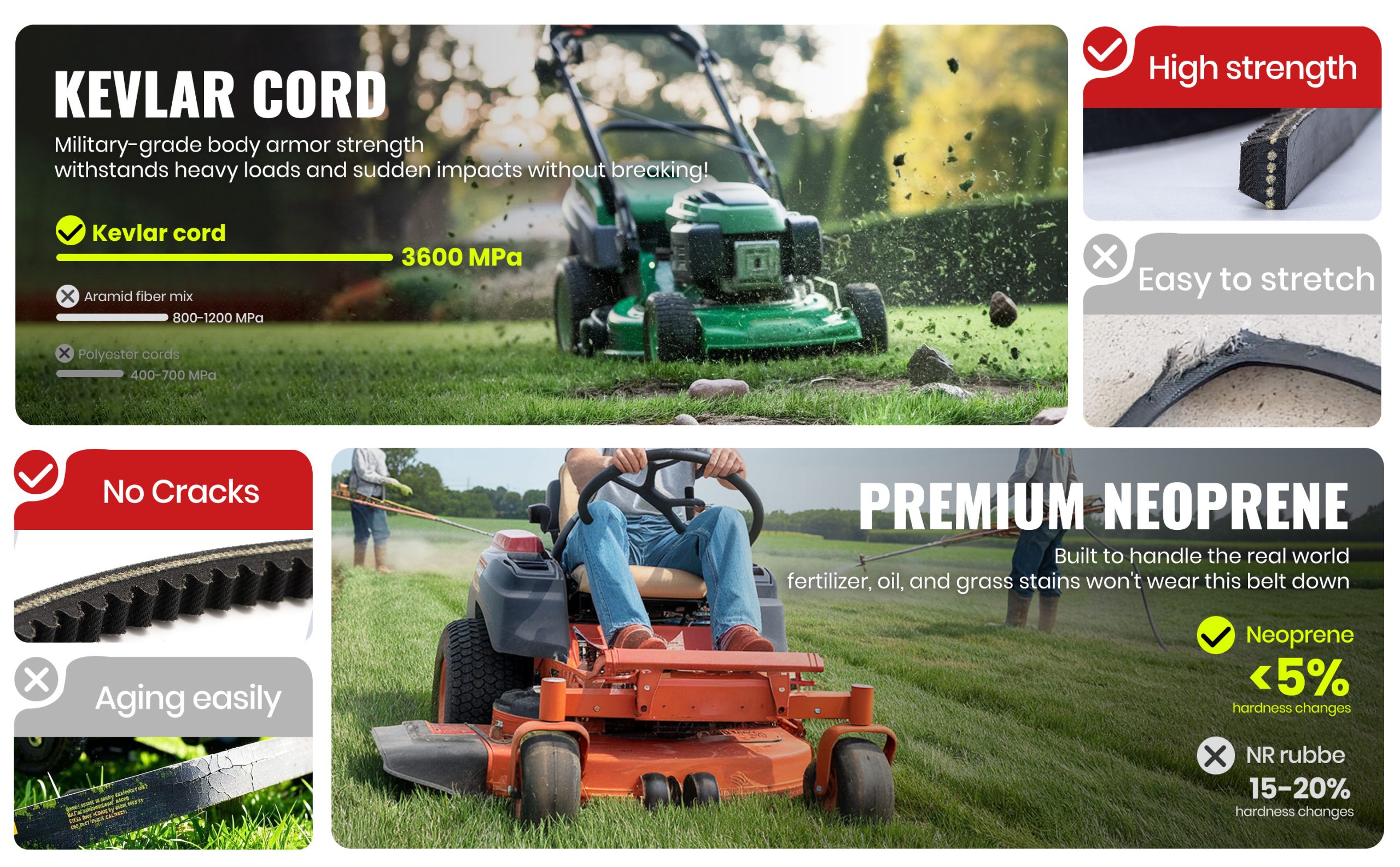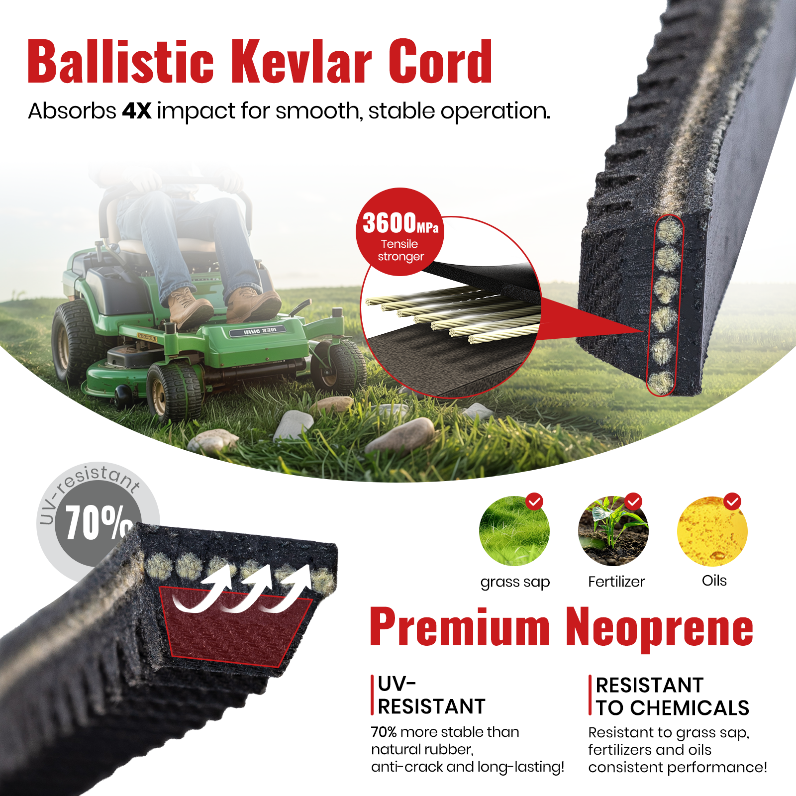• 【UPGRADE DUAL KEVLAR REINFORCEMENT】Built with a Kevlar-tensile cord for strong, stable tension under heavy loads, plus short Kevlar fibers blended into the rubber base to resist cracks and heat. This double-layer upgrade keeps the belt running — even as outer wraps wear down.